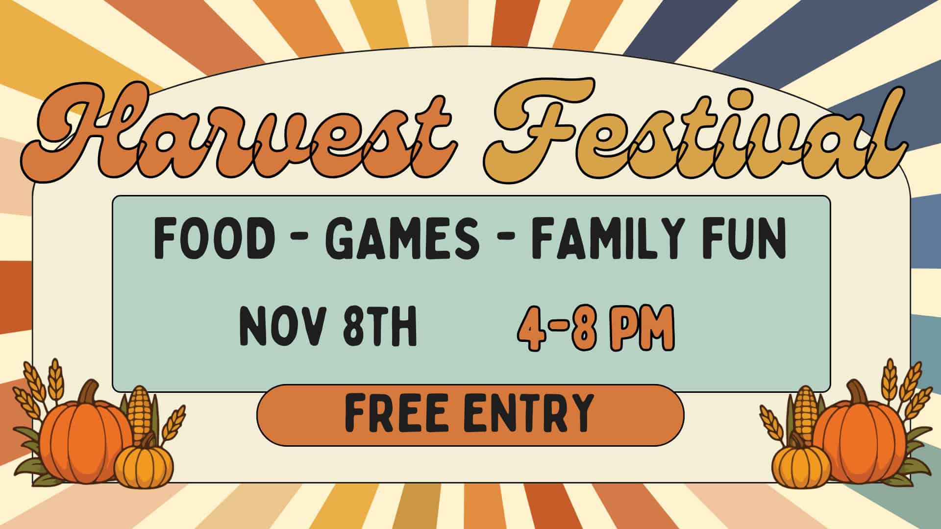 Join us at our annual Harvest Festival on November 8th from 4-8 pm! There will be games, food, and fun for the family!